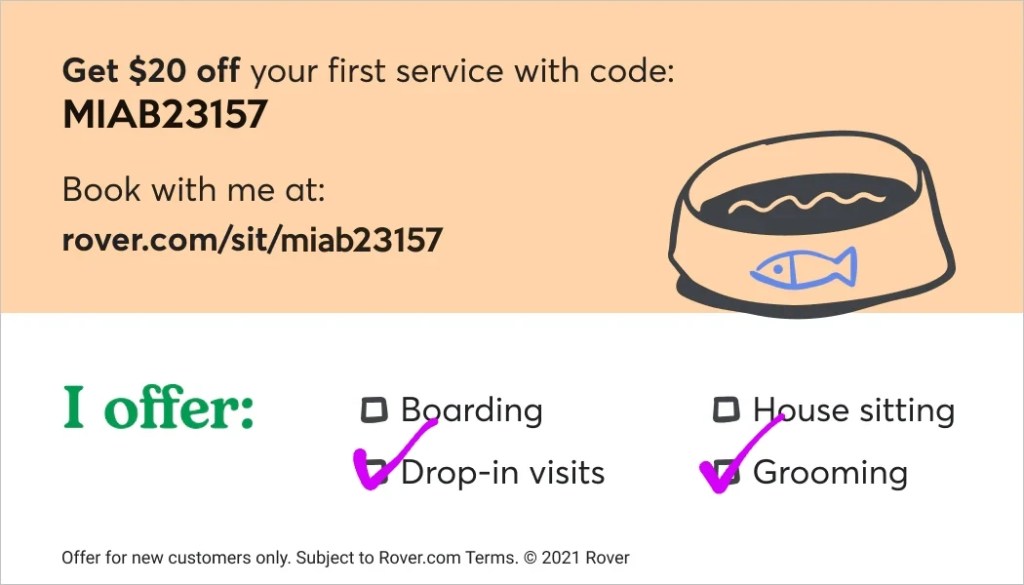 Book with me through Rover! AND, if it’s your first Rover booking, get $20 off your first booking with me using code MIAB23157